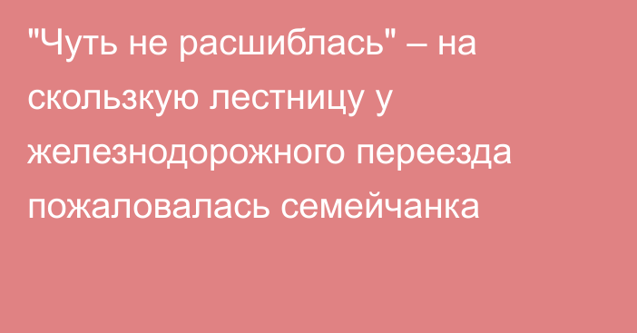 Семейчанка обратилась в редакцию Arnapress.kz с жалобой на неочищенную скользкую лестницу.«У меня вопрос к акимату либо к коммунальным службам, кто отвечает за расчистку снега и льда с тротуаров и прилегающей к проезжей части территории. Вчера я реально чуть не расшиблась у железнодорожного переезда по улице Каржаубайулы, в районе обувной фабрики.