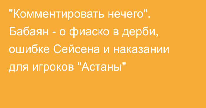 Главный тренер «Астаны» Григорий Бабаян объяснил поражение своей команды в матче 22-го тура казахстанской премьер-лиги (КПЛ) против «Жениса» (2:3). В первую очередь он принёс извинения болельщикам своей команды, сообщает корреспондент Vesti.kz. Продолжение •. Разгром 3:0 случился в матче «Динамо» Зайнутдинова в РПЛ.