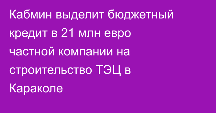 Tazabek — Кабинет министров утвердил выделение бюджетного кредита в эквиваленте 21 млн евро для реализации проекта по реконструкции центральной котельной в Караколе с её модернизацией в теплоэлектроцентраль мощностью 60 МВт.Как говорится в распоряжении кабмина от 22 июля, финансирование предоставляется частной компании на срок 8 лет под 6% годовых с двухлетним льготным периодом.Кредит будет выдан в сомовом эквиваленте [прим.ред.