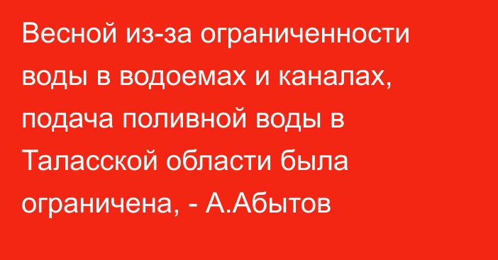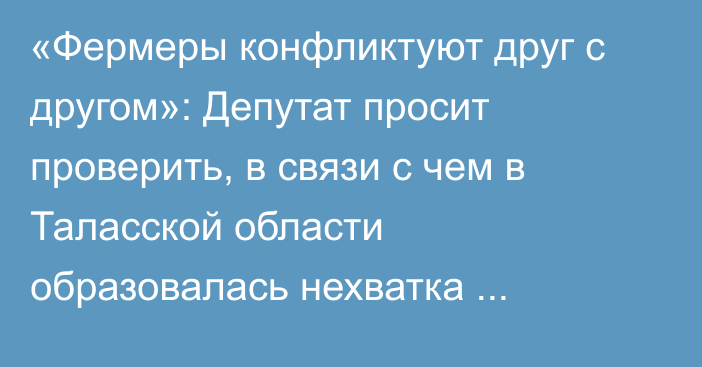 Tazabek — Обеспечение поливной водой и развитие ирригационной инфраструктуры остаются одними из наиболее проблемных вопросов в Таласской долине. Об этом 25 декабря 2025 года на IV Народном курултае заявил делегат от Таласской области Кенжалы Арыкбаев.По его словам, решить проблему мог бы ввод в эксплуатацию водного канала «Кайырма».