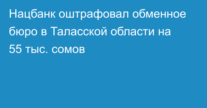 Tazabek — Таласское областное управление Национального банка наложило штраф в размере 55 тыс. сомов на обменное бюро ОсОО «Арал-Чечтобо». Об этом сообщает пресс-служба регулятора.Штраф наложен за нарушение требований законодательства Кыргызской Республики и нормативных правовых актов Национального банка.