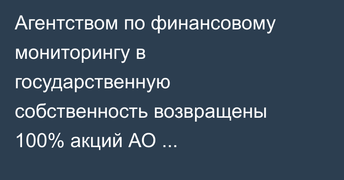 Пресс-служба АФМ РК, 27 июняАгентством по финансовому мониторингу в государственную собственность возвращены 100% акций АО «Таразэнергоцентр«По результатам расследования установлено, что обвиняемые создали организованную преступную группу с целью получения незаконного монопольно высокого дохода, совершили хищение 4,3 млрд тенге, принадлежащих государству, а также легализовали средства через подконтрольную сеть обнальных предприятий.Приговором суда 8 лиц осуждены к лишению свободы на сроки от 3 до 13 лет.