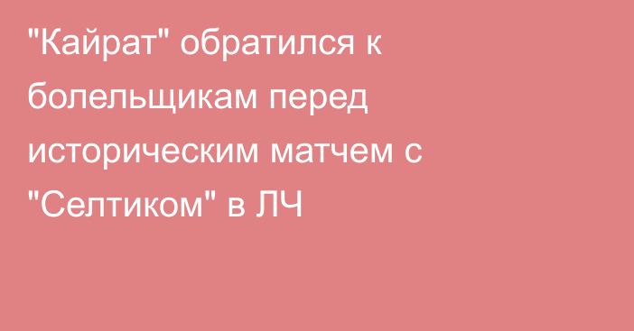 ФК «Кайрат» обратился к болельщикам перед матчем с шотландским «Селтиком» в Лиге чемпионов, передают Vesti.kz. Продолжение •. «Селтик» заинтересован в звёздном форварде перед матчами с «Кайратом». Вчера 11:23 •. «Кайрат» потерял трёх легионеров перед матчем с «Селтиком». Как их заменить? Вчера 12:30 •.