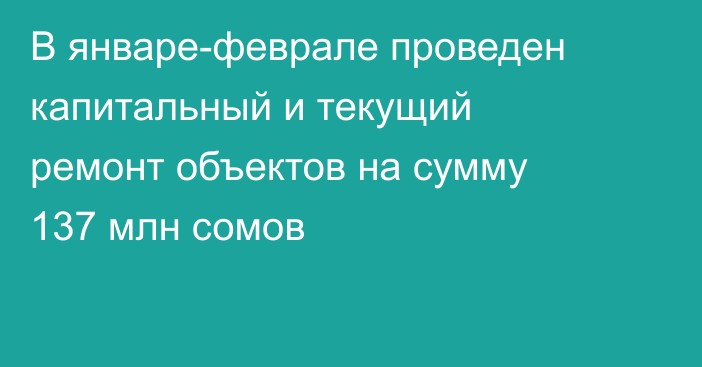 В январе-феврале проведен капитальный и текущий ремонт объектов на сумму 137 млн сомов