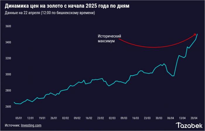 Ранее мы писали о том, что цена на золото впервые превысила $3505 за унцию (12:00 по бишкекскому времени).