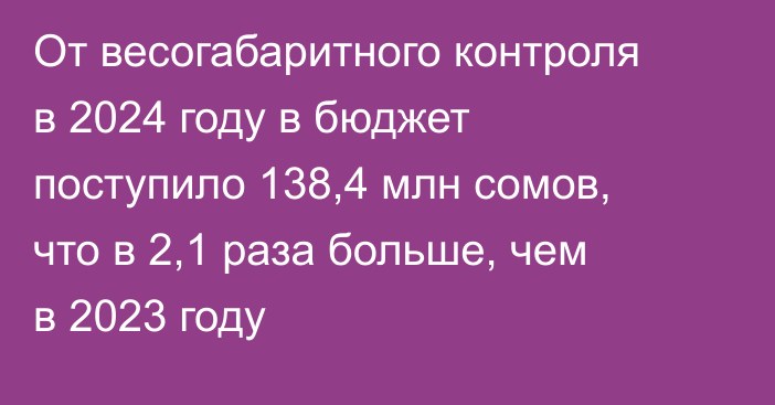 Tazabek — От весогабаритного контроля в 2024 году поступило 138,4 млн сомов или по сравнению с 2023 годом поступило в 2,1 раза больше, а по сравнению с 2022 годом — в 4,7 раза. Об этом Tazabek сообщили в Министерстве транспорта и дорог.