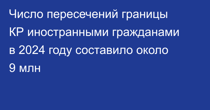Нацстатком со ссылкой на данные Государственной пограничной службы сообщает, что число пересечений границы Кыргызской Республики иностранными гражданами по стране гражданства (прибытий) в 2024 году составило около 9 млн и по сравнению с 2023 годом увеличилось на 1,1%.