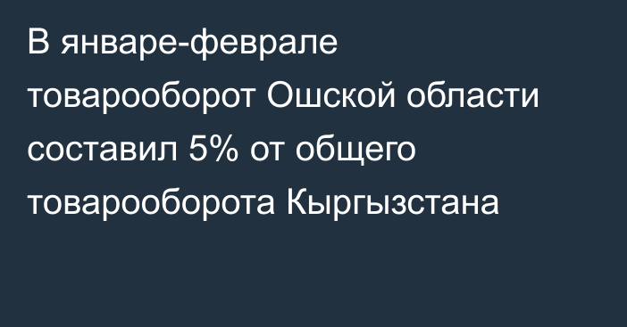 Темпы роста товарооборота Ошской области в январе-феврале 2025 года практически не изменились по сравнению с аналогичным периодом 2024 года, когда он составлял $103 млн.