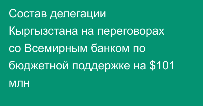 По данным ведомства, в официальную делегацию Кыргызстана для проведения переговоров со Всемирным банком в рамках реализации бюджетной поддержки на 2025 год в размере 100 млн долларов США по программе «Операции в поддержку политики развития» вошли: