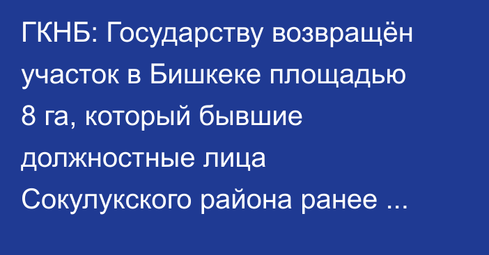 Спецслужба выявила, что этот муниципальный земельный участок отдельные должностные лица Сокулукского района ранее противоправно вывели в частную собственность. ГКНБ установил, что участок предназначался для коммерческого использования и был передан аффилированным лицам, в том числе, близким родственникам бывших должностных лиц Сокулукского района.