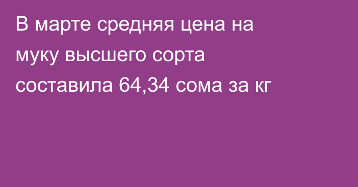 В марте 2024 года средняя потребительская цена на муку в целом составляла 67,66 сома за килограмм.