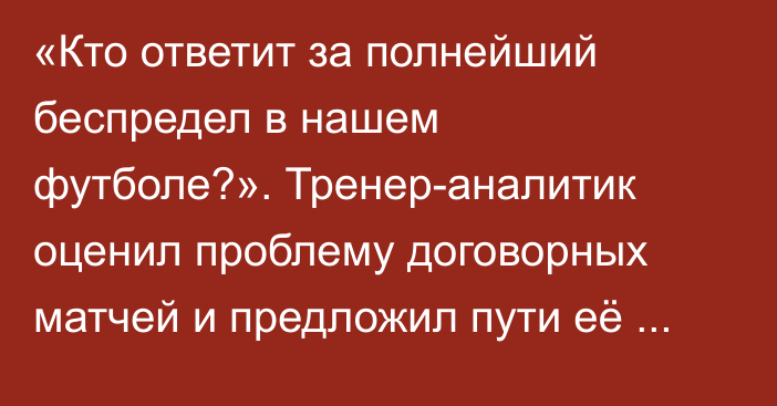 Корреспондент республиканского интернет-портала Sports.kz связался с известным казахстанским тренером и аналитиком Павлом Черепановым, который поделился мнением о проблеме договорных матчей и предложил пути её решения.