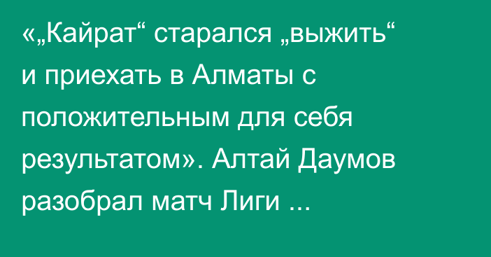 Корреспондент республиканского интернет-портала Sports.kz связался со спортивным функционером и экс-кандидатом в президенты Казахстанской Федерации футбола Алтаем Даумовым, который разобрал игру «Кайрата» против «Олимпии», назвал лучшего игрока матча и оценил шансы команд на проход.