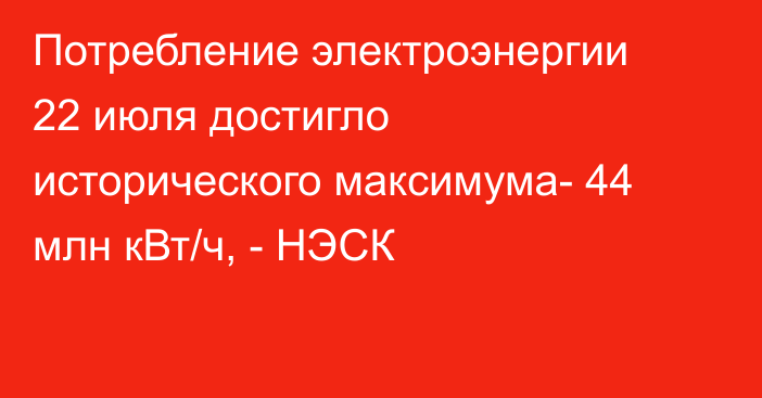 Стало известно, что 22 июля 2025 года суточное потребление электроэнергии в энергосистеме Кыргызстана достигло 44 млн 124 тыс. кВт/ч.
