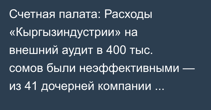 «Из 41 дочернего предприятия работы выполнены только по одному объекту (ОсОО «Кыргызстиль»), оплату в размере 400 тыс. сомов следует считать неэффективными расходами», — говорится в отчете по итогам аудита.