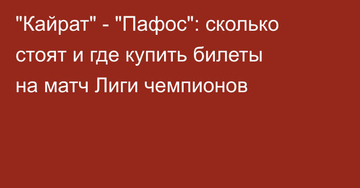 Сегодня, 13 октября, стартовали продажи билетов на матч третьего тура общего этапа Лиги чемпионов УЕФА сезона-2025/26, в котором алматинский «Кайрат» примет кипрский «Пафос», передают Vesti.kz. Продолжение •. «Астана» потроллила «Кайрат» за цены билетов на матч Лиги чемпионов. 13 октября 16:48 •. В британском клубе ждут Чеснокова — они хотят переписать историю спустя 65 лет.