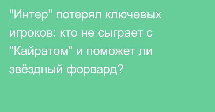 Уже послезавтра, 5 ноября, миланский «Интер» примет на своём поле алматинский «Кайрат» в матче четвёртого тура общего этапа Лиги чемпионов. Корреспондент Vesti.kz рассказывает о кадровых вопросах итальянского гранда.Если «Кайрат» подходит к игре без потерь, то у «Интера» с этим дела обстоят посложнее.